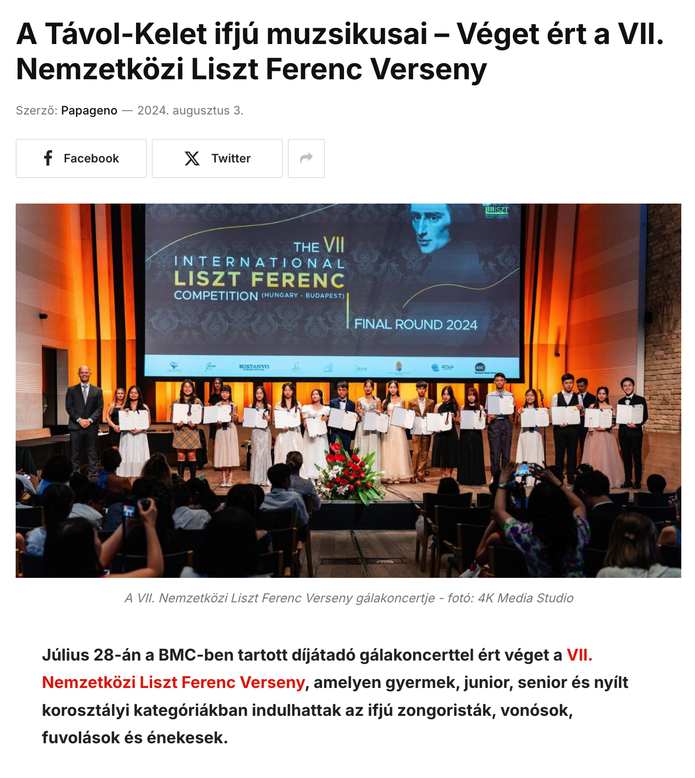 匈牙利藝術及人文網站PAPAGENO為2024第七屆李斯特(匈牙利布達佩斯)國際公開賽總決賽的報道